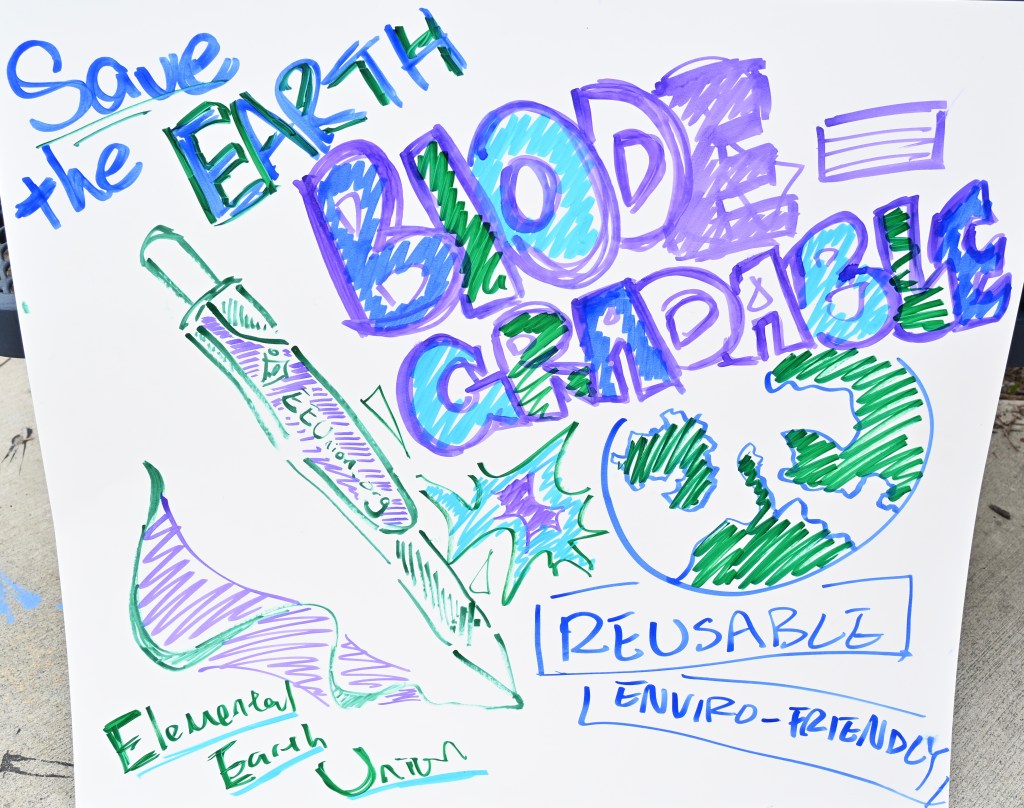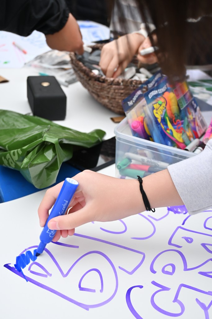 Meanwhile, a second table welcomed students to grab bright markers and add their voices to a collaborative Earth Week board. The result? A large, bold poster shouting:
