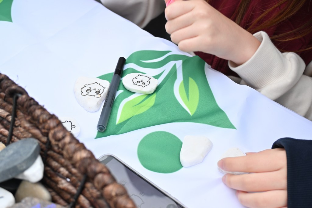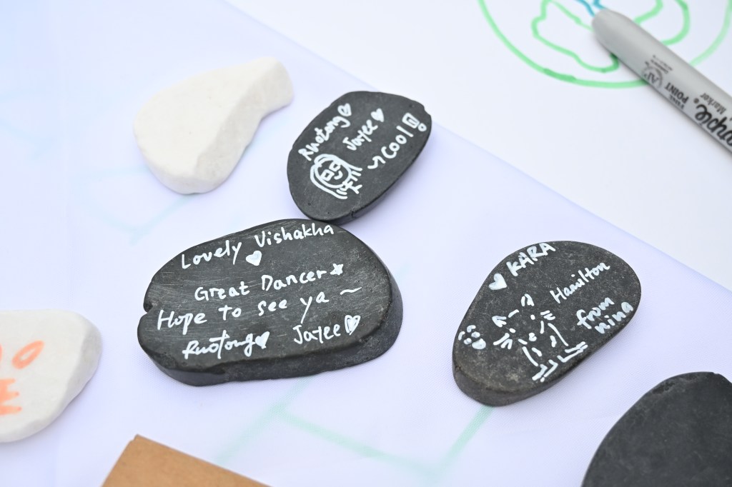 Yesterday’s stone painting table had already sparked a wave of interest—and today, it evolved. Dozens of new stones appeared, this time more expressive, more symbolic. Some students painted characters, some shared inside jokes, while others wrote heartfelt messages to friends, to nature, or even to themselves.